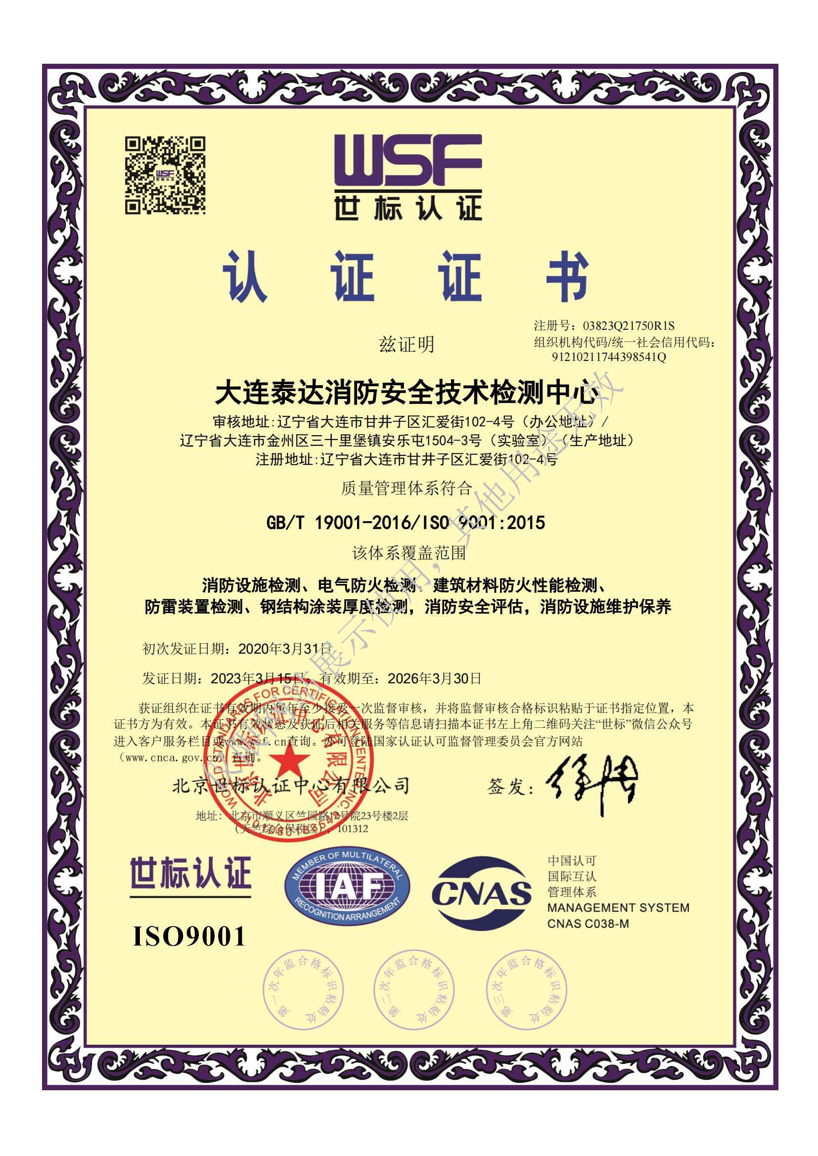 · 是經“社會消防技術服務信息系統”備案并公示的消防技術服務機構,已取得中國氣象局頒發的雷電防護裝置檢測資質證書、遼寧省質量技術監督局審核批準的檢驗檢測機構資質認定證書(CMA)及包括消防檢測、電氣檢測、雷電防護裝置檢測、防火涂層厚度檢測等在內的200余項檢驗檢測能力,取得大連市應急管理局頒發的安全生產標準化證書,獲得質量管理體系、環境管理體系、職業健康安全管理體系認證證書,是經備案的高新技術企業,可獨立出具具有證明作用的檢測報告。